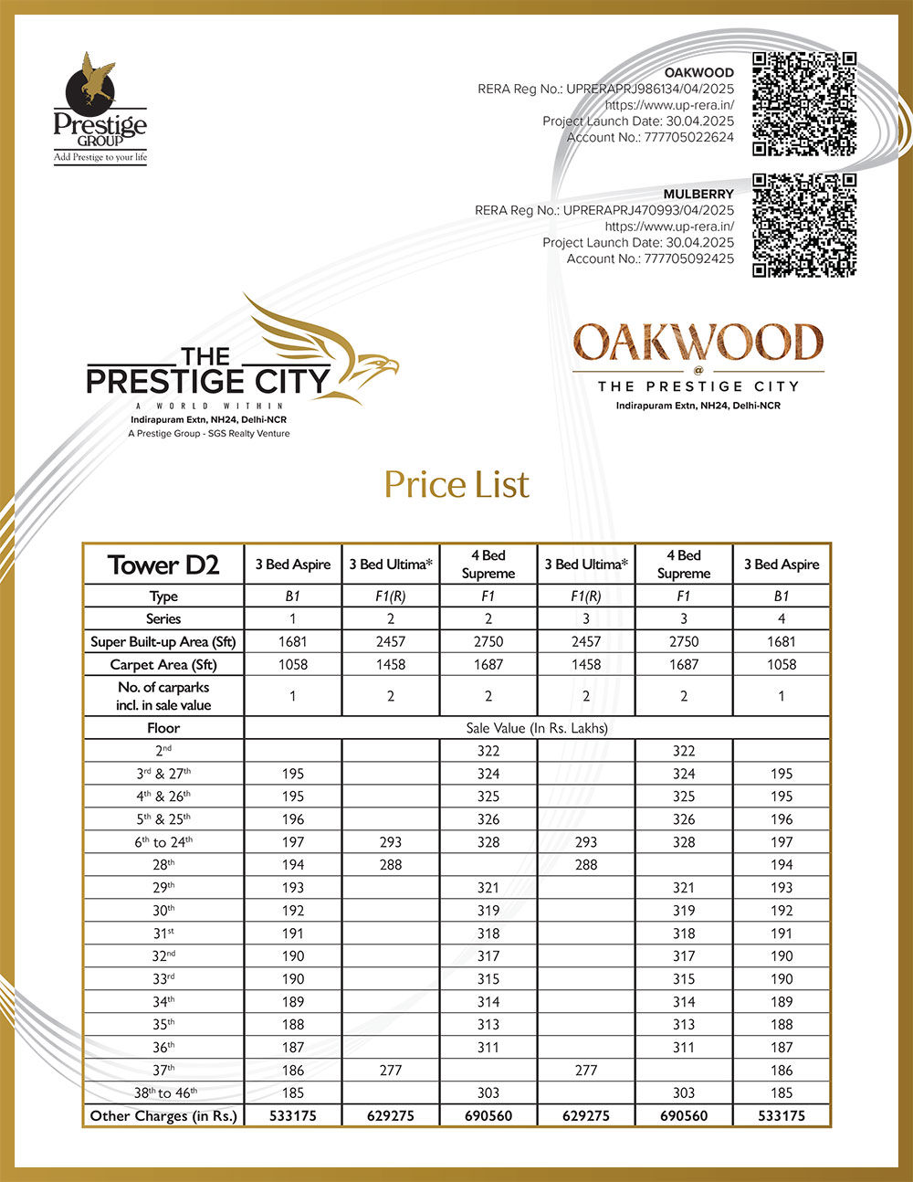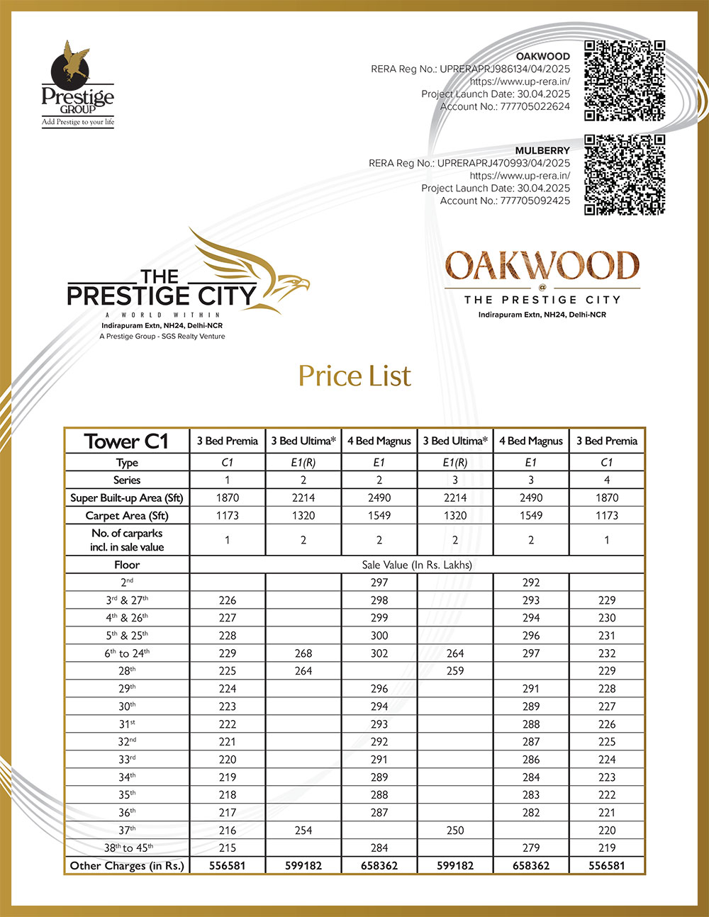 The Prestige City NH24, Indirapuram Extension, Ghaziabad, is near Noida Sector 62/63. It supports an exotic lifestyle, allowing residents to enjoy their traditions and cultures alongside Western influences. This latest residential project has an ambitious vision to offer dream homes, duplexes, and penthouses. The Prestige City is poised to provide 2/3/4/5/6BHK premium apartments ranging from 1301 to 6026 sq. feet in OAKWOOD and MULBERRY iconic towers. This project features RCC framing-based construction combined with MIVAN Technology for high-end strength and striking aesthetics. The Prestige City offers an array of ultra-modern amenities. Residents will enjoy a swimming pool for toddlers, clubhouses, community halls, rainwater harvesting systems, podium-based construction, a centralized auditorium, gardens, parks, lawns with a jogging track, and much more. Thus, this will be an unbeatable combination of luxury and convenience, making it the most desirable home for seekers and investors.